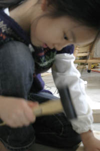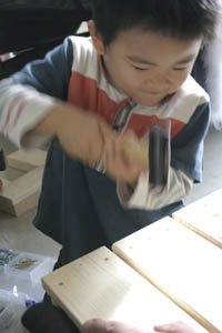 何が何でも自分で!とがむしゃらに釘を打つ弟。
