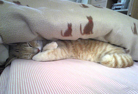 と思ったら、リビングにひいた娘の布団にもぐって?はさまって?