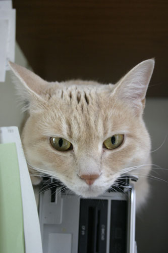 ほぼ一日中付けっぱなしのパソコンの上は、暖かく、適度な振動が気持ちいいのでしょうか。