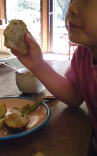天然酵母パンにかぼちゃのスープをつけて食べるのがおいしい。