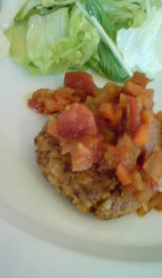 ハンバーグ、米粉のバナナケーキ豆腐クリーム添え、コーヒー。